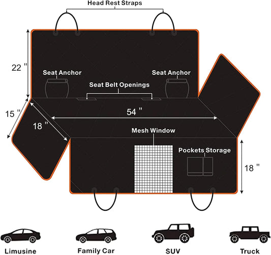 Dog Car Seat Cover, Waterproof Nonslip Pet Seat Cover for Back Seat with Storage Pockets Mesh Visual Window, Black Heavy Duty Scratchproof Pet Dog Seat Cover Hammock for Cars Trucks
